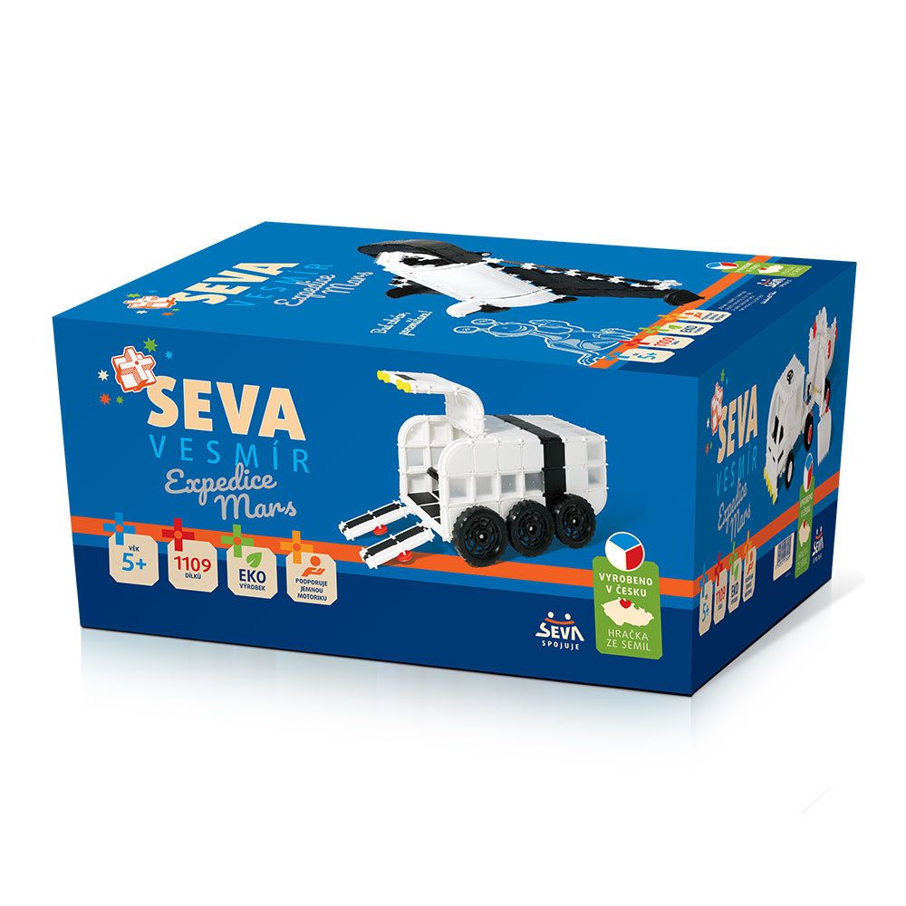 V nových farbách (čierne a biele prevedenie) postavíte úžasné vozidlá a reketoplány. Stavebnica SEVA VESMÍR – Expedícia Mars obsahuje 1015 dielov. Je určená deťom od 5 rokov. Vyhovuje európskej norme EN71 o bezpečnosti hračiek a jej kvalita je pravidelne kontrolovaná. Všetky stavebnice SEVA sú navzájom kompatibilné a ich možnosti sa dajú stále rozširovať.