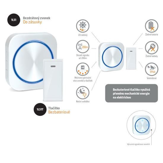 Tento bezdrôtový zvonček prináša inteligentné riešenie vďaka tlačidlu bez potreby batérií. Elektrický signál je vytváraný prevodom mechanickej energie pri stlačení - systém na princípe dynama. Odpadá tak nutnosť výmeny batérií, ktorú oceníte najmä v zimnom období alebo pri častom používaní. Prijímač stačí zapojiť do zásuvky, tlačidlo pripevniť na dvere a všetko je pripravené na prevádzku.