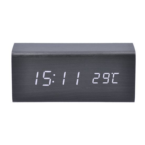 Štýlový LED budík s funkciou ovládania zvuku. Elegantný LED budík v čiernom drevenom vyhotovení ponúka moderné funkcie vrátane zobrazenia spánku, budenia tlesknutím a nastaviteľnej intenzity podsvietenia. Zobrazuje čas (12/24 h), dátum, rok a vnútornú teplotu. Tri nastavenia budíka a možnosť výberu rôznych režimov zobrazenia. Vstavaná batéria uchováva nastavené hodnoty. Napájanie pomocou kábla USB (je súčasťou balenia) alebo 3x batérií AAA (nie sú súčasťou balenia).