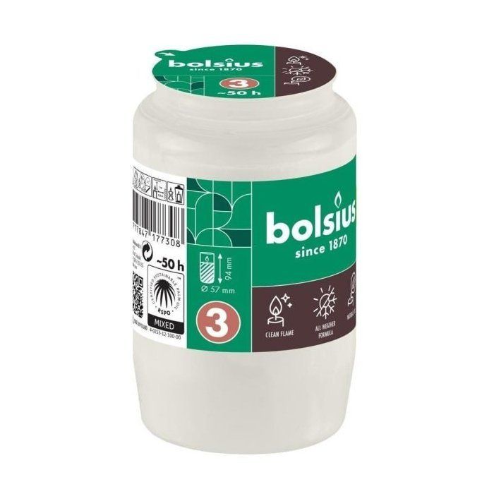 Olejová náplň Bolsius vyhorí až do konca, horí krásnym rovnomerným plameňom aj pri vysokej vlhkosti, veternom počasí alebo mraze. Nedymí, nefarbí a neničí lampáše. Doba horenia: 50 hodín.