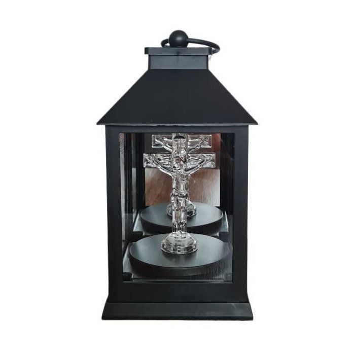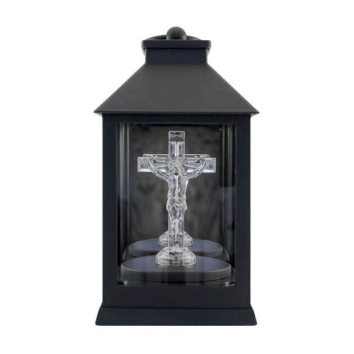 Lampáš LED Ceremony – čierny lampáš s bielym krížom, 20 cm