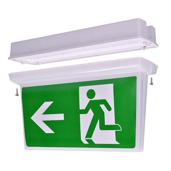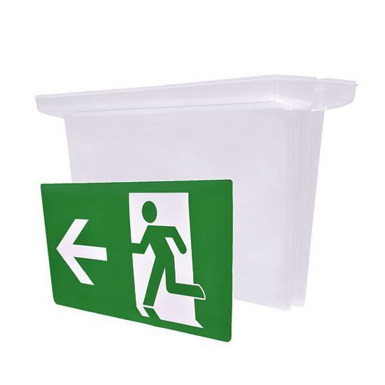 Značka je vyrobená z odolného PC materiálu a má rozmery 352 × 185 × 110 mm. Možno ju jednoducho namontovať na stropné svietidlá a doplniť požadovaným značením podľa špecifických potrieb budovy.