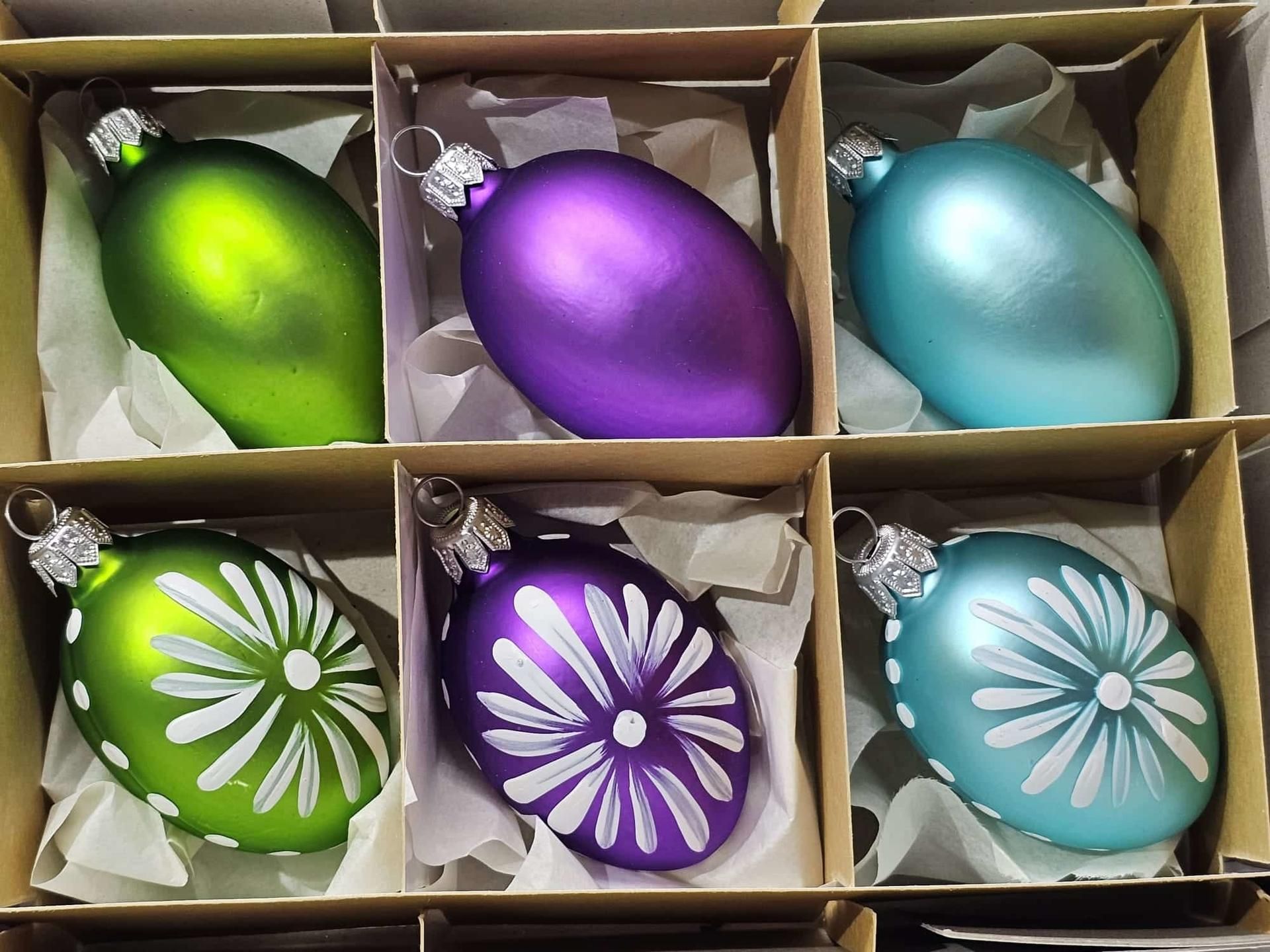 Súprava 6 kusov sklenených vajíčok o rozmere 4,5 x 7,5 cm, tri kusy s dekorom a 3 kusy bez dekoru.