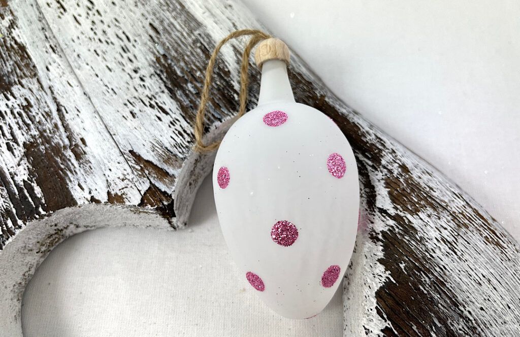 Sklenené vajíčko s ružovými bodkami. Na zavesenie poslúži jutový špagátik na drevenej čiapočke.