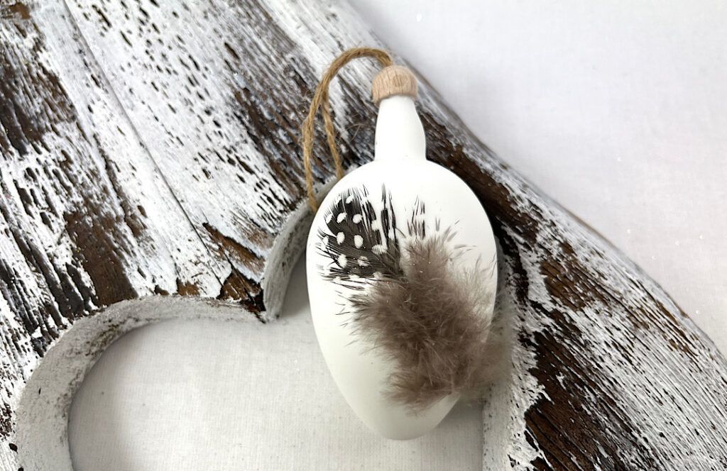 Sklenené vajíčko s pierkom . Na zavesenie poslúži jutový špagátik na drevenej čiapočke.