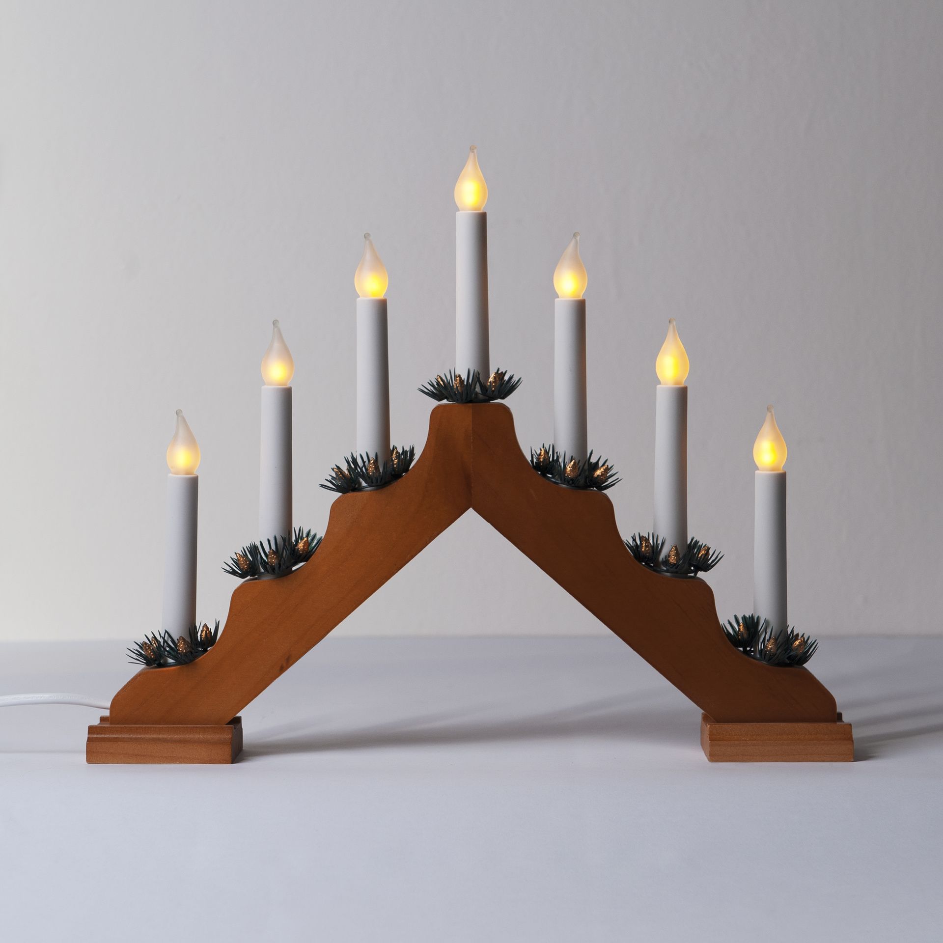 Adventní Svietnik drevený , morený ako dub , Biela LED žiarovka - imitácia plameňa 7x34 V / 0,2W