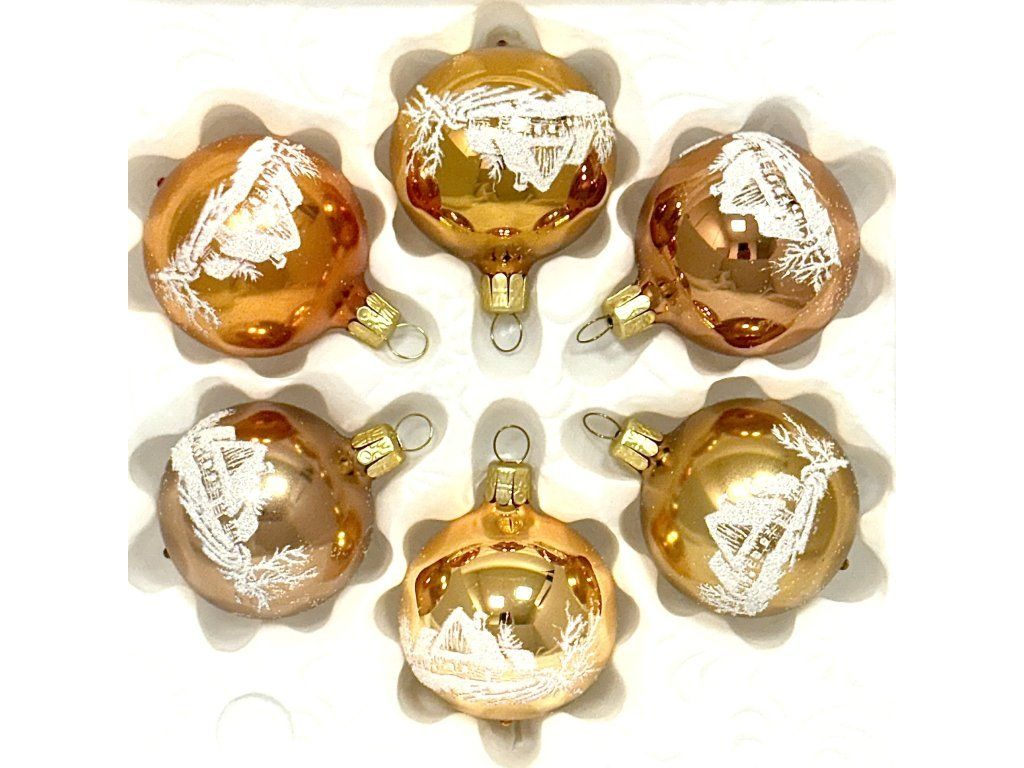 Sklenené vianočné ozdoby „Tamar – Zlatý lesk tradície“ v elegantných odtieňoch zlata, bronzu a medi s jemným ručne maľovaným zimným motívom prinášajú teplo a nostalgiu tradičných Vianoc.