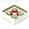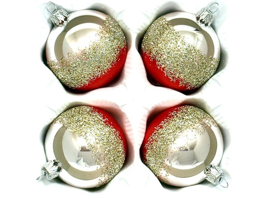 Ručne fúkané gule z českého skla s priemerom 7 cm. Zrkadlovo šampanská plocha sa diagonálne pretína s matnou rubínovo červenou; medzipásmo zdobí bohatá vrstva zlatého glitra. Súprava 4 ks v ochrannej papierovej krabičke.