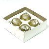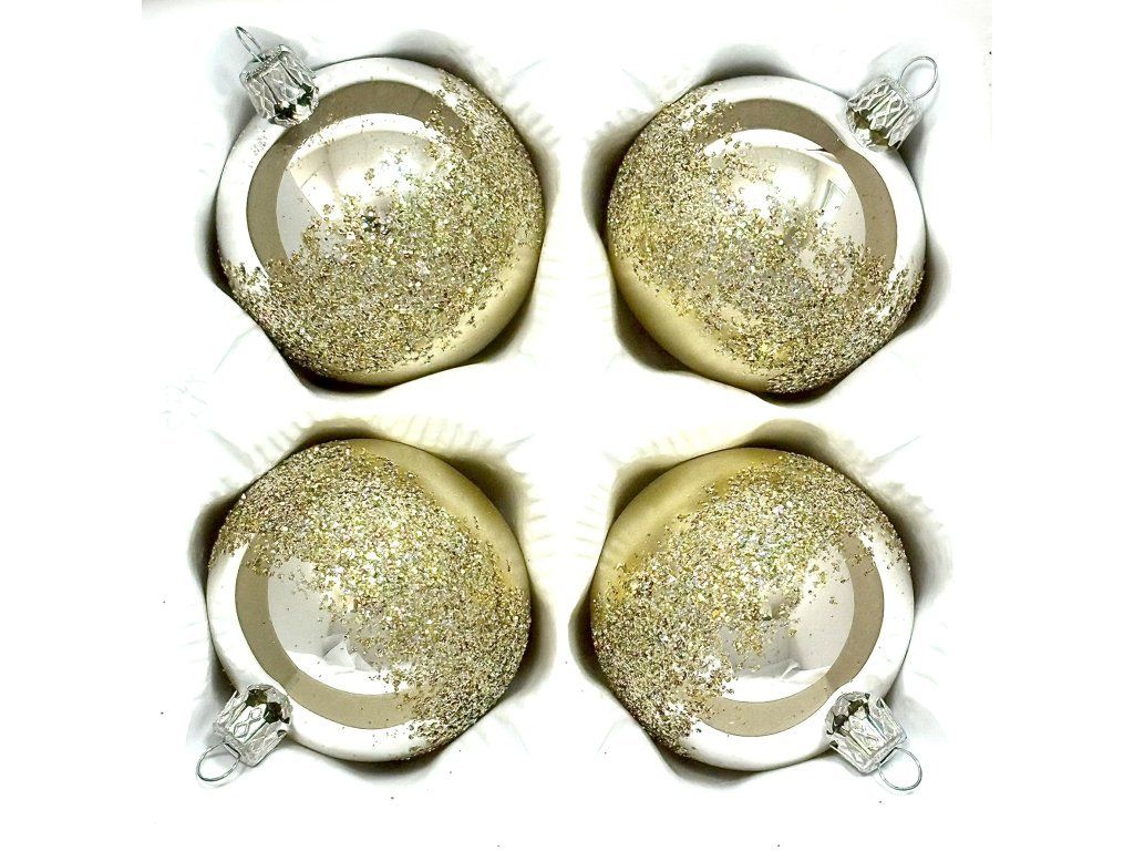 Ručne fúkané gule z českého skla s priemerom 7 cm. Celý champagne podklad – z polovice zrkadlovo lesklý, z polovice zamatovo matný – prechádza do bohatej vrstvy jemného zlatého glitra. Súprava 4 ks v ochrannej papierovej krabičke.