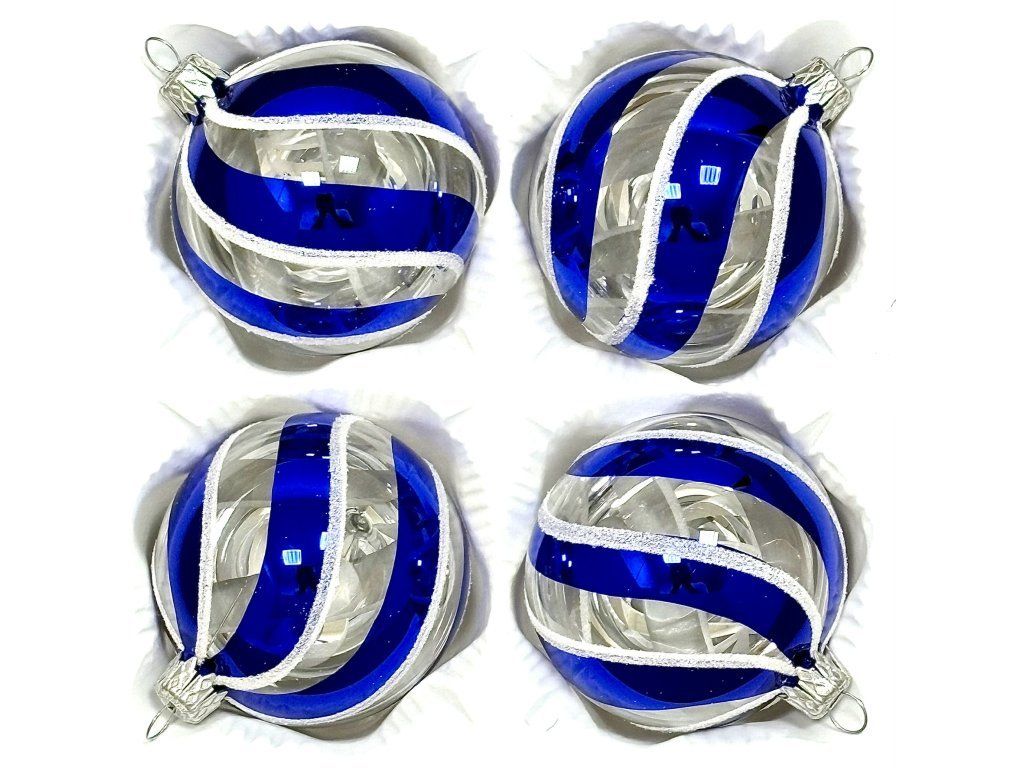 Ručne fúkané gule z českého skla s priemerom 7 cm. Krištáľovo číre sklo pretínajú sýto kobaltové špirálové pruhy, orámované zamatovo bielym „mrazom“. Súprava 4 ks v ochrannej papierovej krabičke.