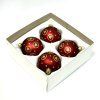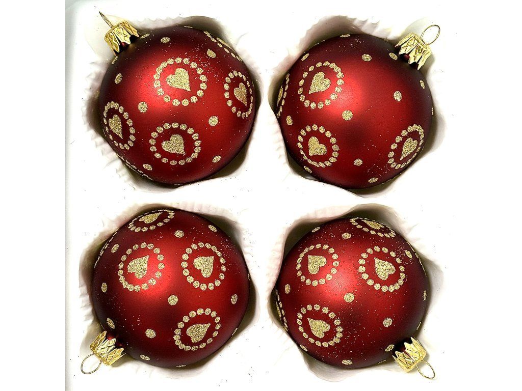 Ručne fúkané gule z českého skla, matne červené, zdobené ornamentom z jemného zlatého glitra v tvare srdiečok obklopených bodkami. Balenie 4 ks.