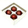 Ručne fúkané gule z českého skla s priemerom 7 cm s matným červeným nástrekom, dekorované tenkými linkami a filigránovými siluetami vtáčikov v trblietavom zlatom glitri. Súprava štyroch kusov v ochrannej krabičke.