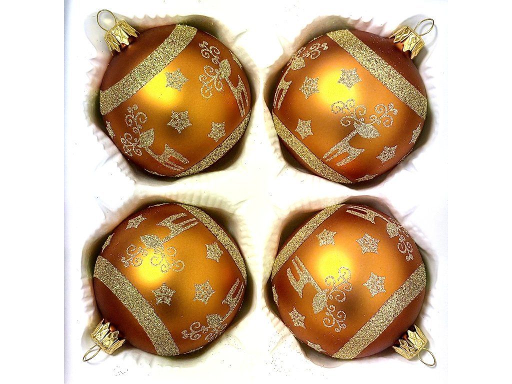 Ručne fúkané gule z českého skla v matnom medenom odtieni, zdobené zlatým glitrom v tvare sobov a hviezd. Balenie 4 ks.