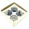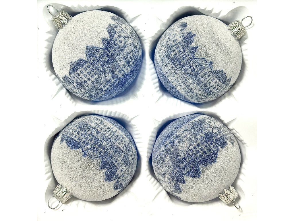 Ručne fúkané gule s jemným „snehovým“ posypom. Striebristo biely vrch prechádza do polnočne modrej a po obvode sa vinie detailná silueta zasnežených domčekov. Priemer 7 cm, balenie 4 ks v papierovej krabičke.