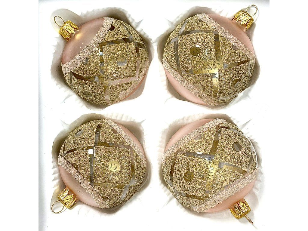 Ručne fúkané gule z českého skla s priemerom 7 cm. Zamatovo púdrový ružový podklad, zlatá mozaiková dekorácia s glitrom. Súprava 4 ks v ochrannej papierovej krabičke.