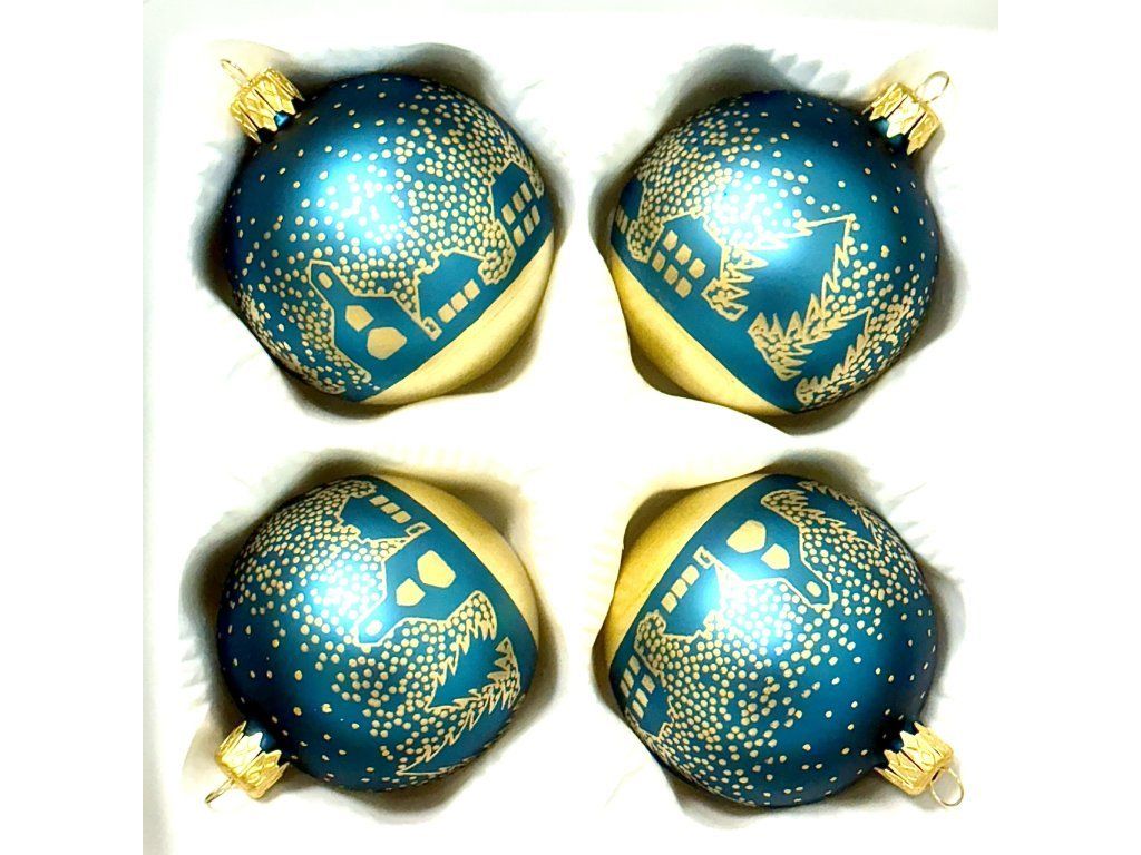 Ručne fúkané české sklenené gule v magickej tyrkysovej farbe, zdobené jemnou frostovou technikou so zlatou zimnou krajinou.