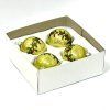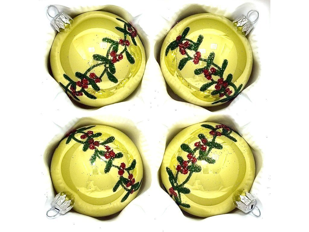 Ručne fúkané gule z českého skla (Ø 7 cm) v lesklom vanilkovom tóne. Ozdobené girlandou zeleného imela a červených bobúľ z jemného glitra. Balenie 4 ks v ochrannej papierovej krabičke.