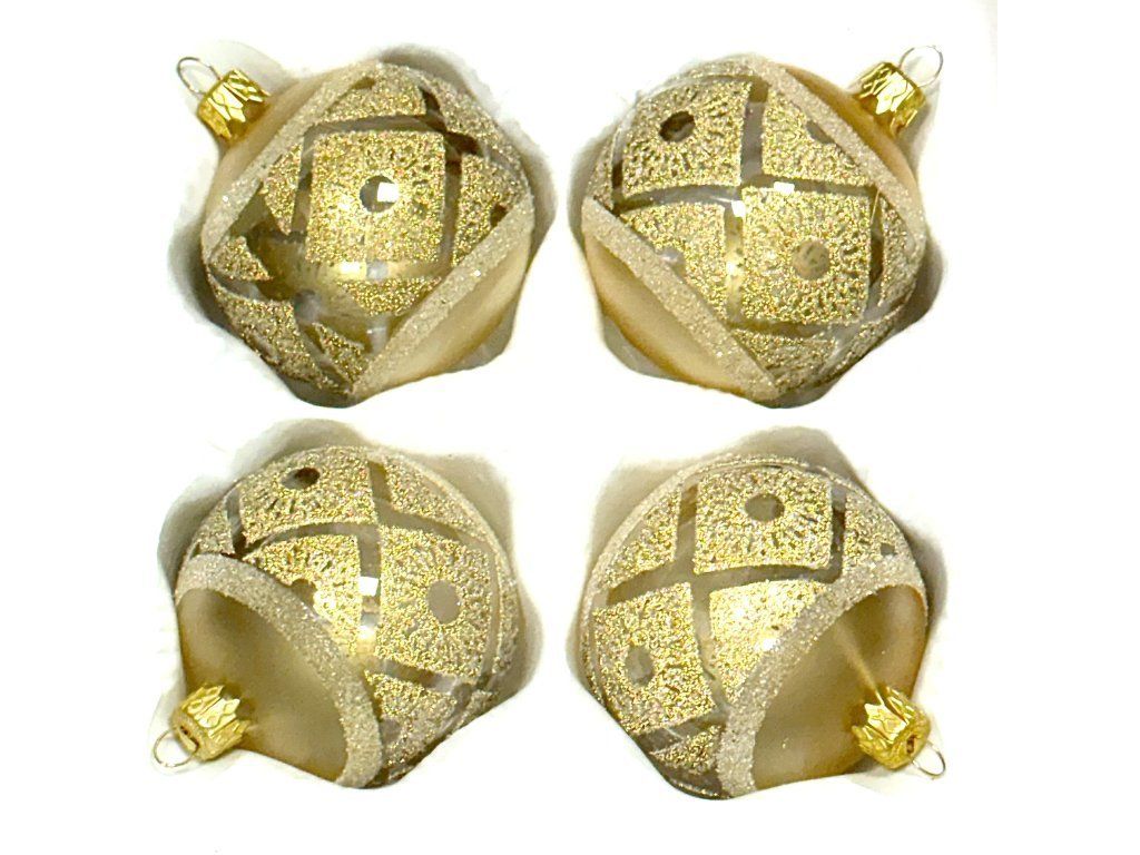 Ručne fúkané gule z českého skla s priemerom 7 cm. Matne šampanský podklad, zlatá mozaiková dekorácia s jemným glitrom a brúsenými kamienkami. Súprava 4 ks v ochrannej papierovej krabičke.