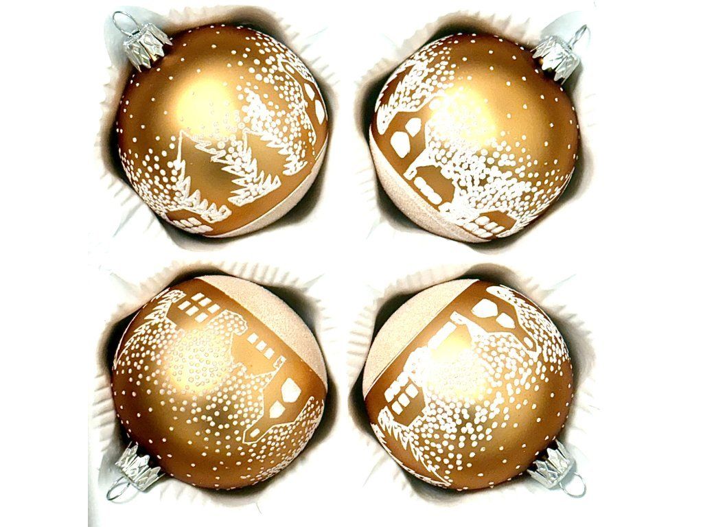 Ručne fúkané gule z českého skla v teplom zlatom odtieni, zdobené motívom zasneženej dedinky a stromov bielou frostovou technikou.