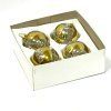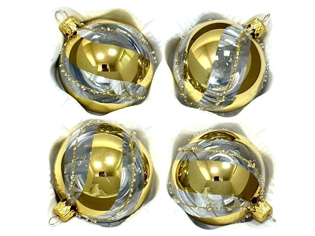 Ručne fúkané gule z českého skla s priemerom 7 cm. Zrkadlovo zlaté plochy sa striedajú s dymovo čírymi pásmi, ktoré obtáča jemná špirála z drobunkých zlatých perličiek. Súprava 4 ks v ochrannej papierovej krabičke.