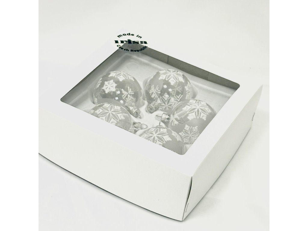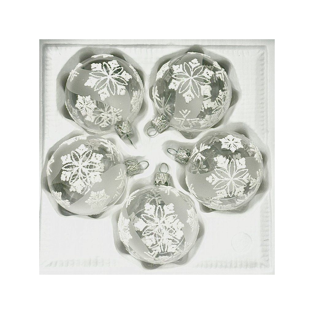 Súprava piatich čírych sklenených gulí s priemerom 6 cm s jemným dekórom bielych vločiek. Elegantné a nadčasové ozdoby ručne vyrobené v Českej republike.