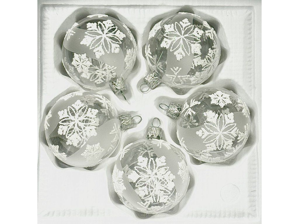 Sklenené vianočné gule 6 cm – Číre s bielymi vločkami (sada 5 ks)