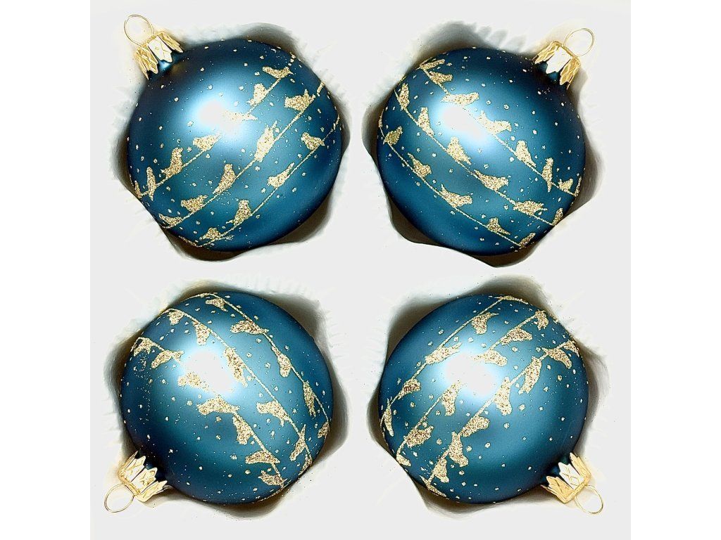 Matné tyrkysové vianočné gule so zlatým dekorom vtáčikov na vetve – kúzelná a poetická ozdoba z českého skla.