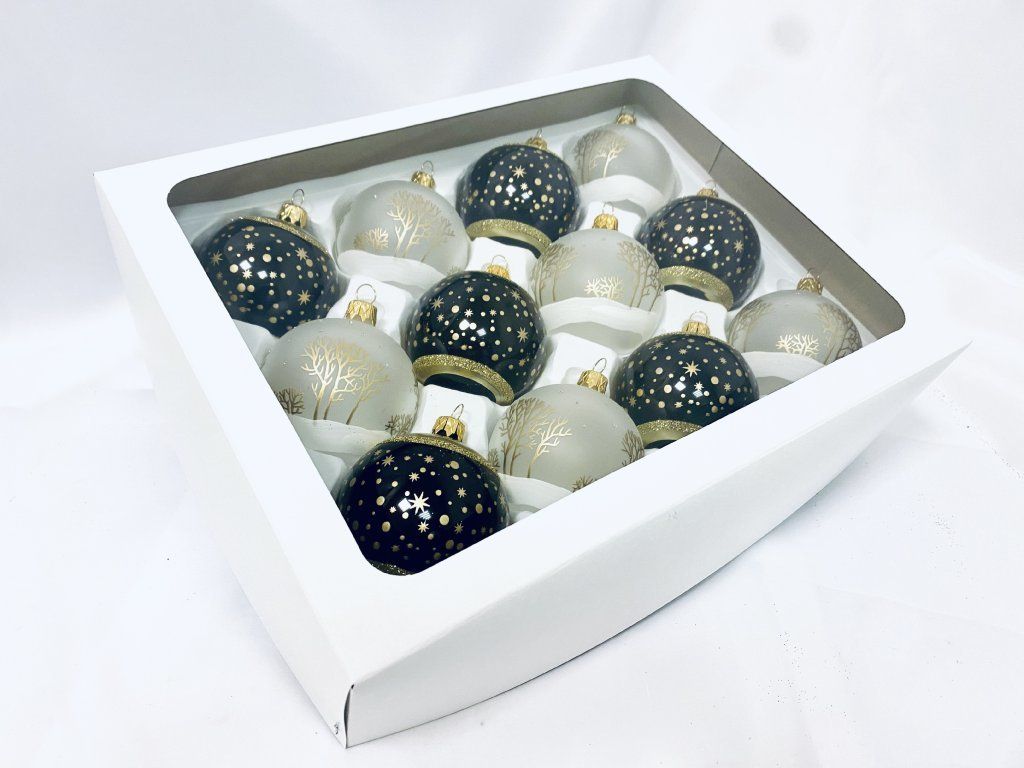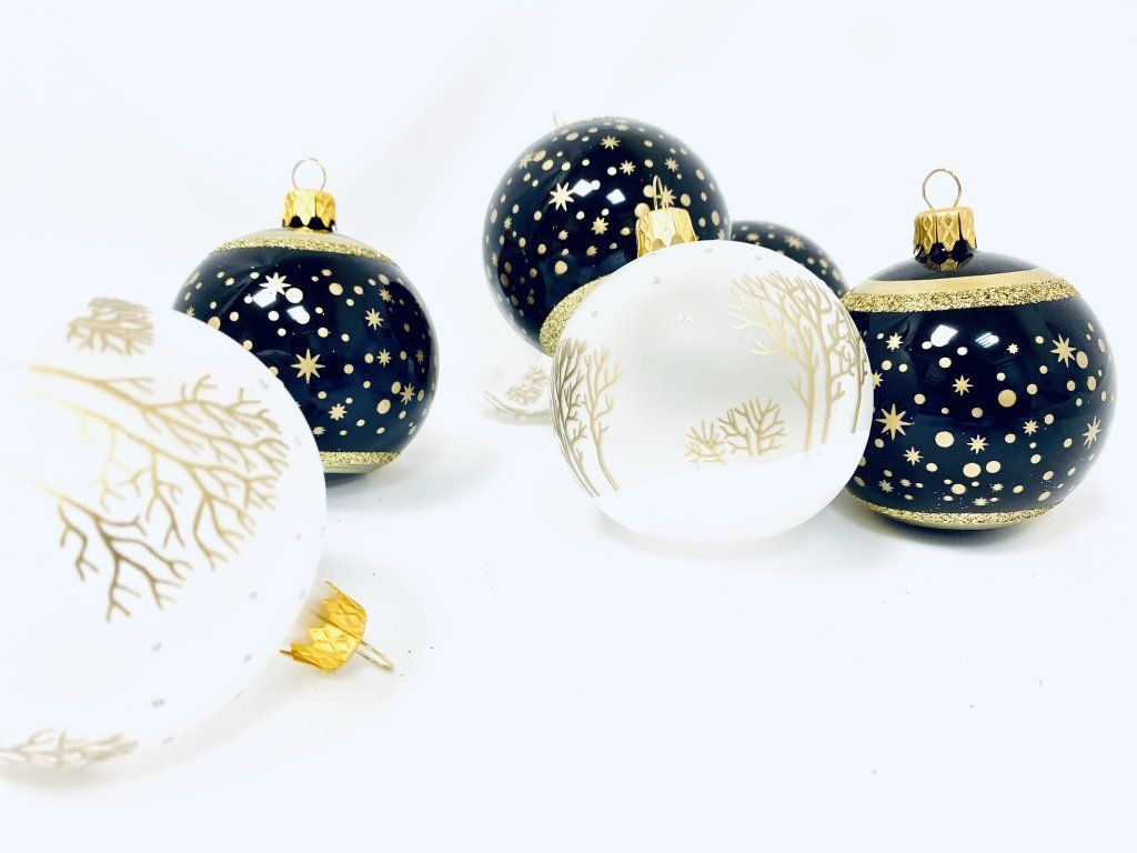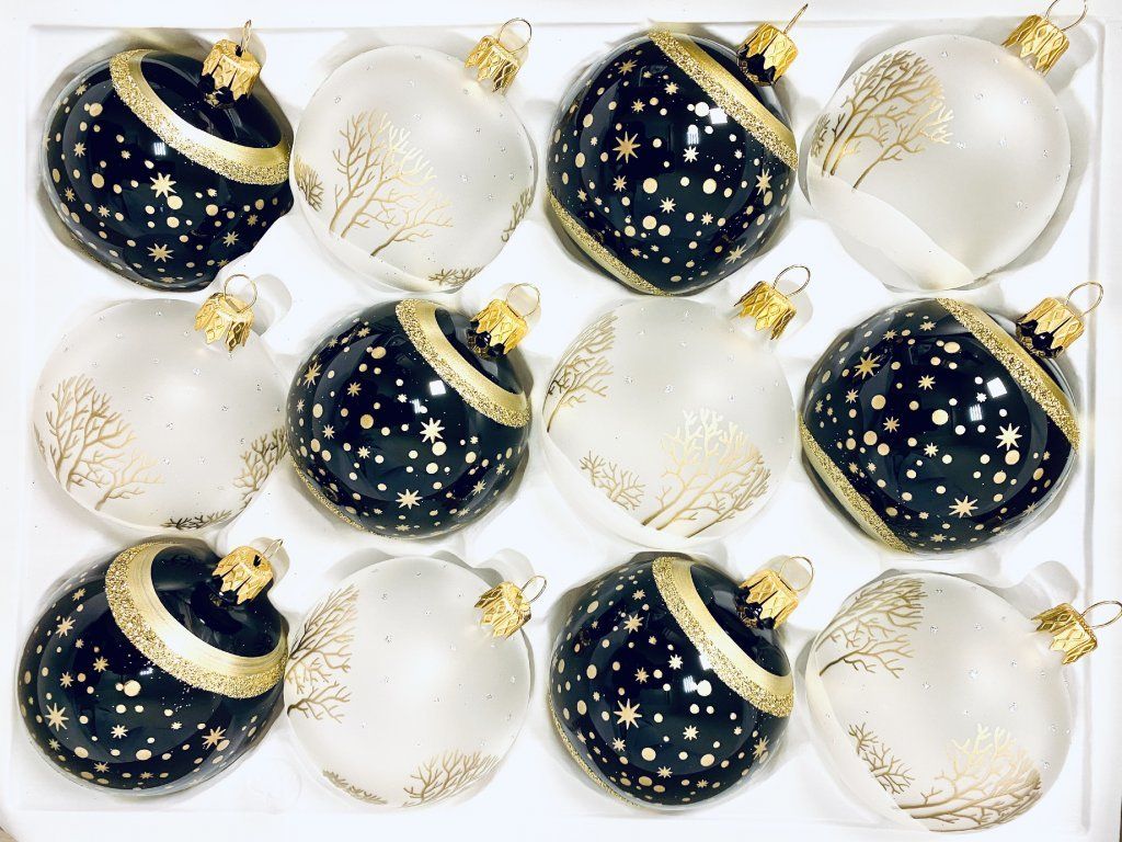 Sada 12 ks sklenených vianočných gulí 7 cm - motív Popolušky a Večernice (biela a čierna, veľkosť 7cm)"
