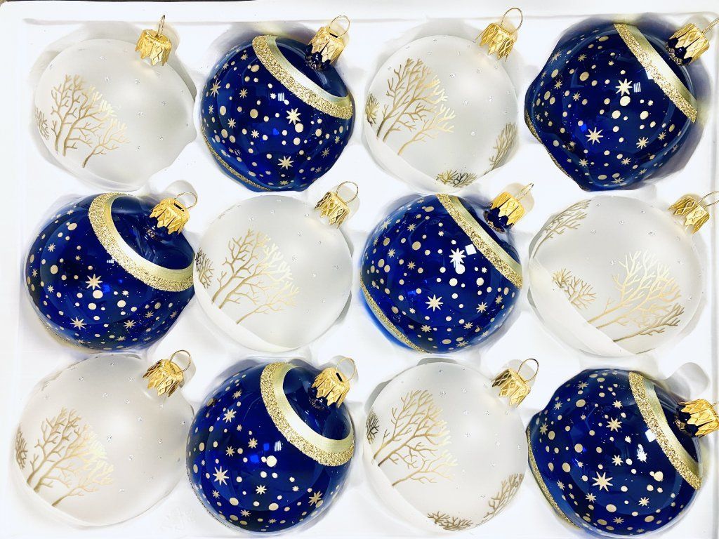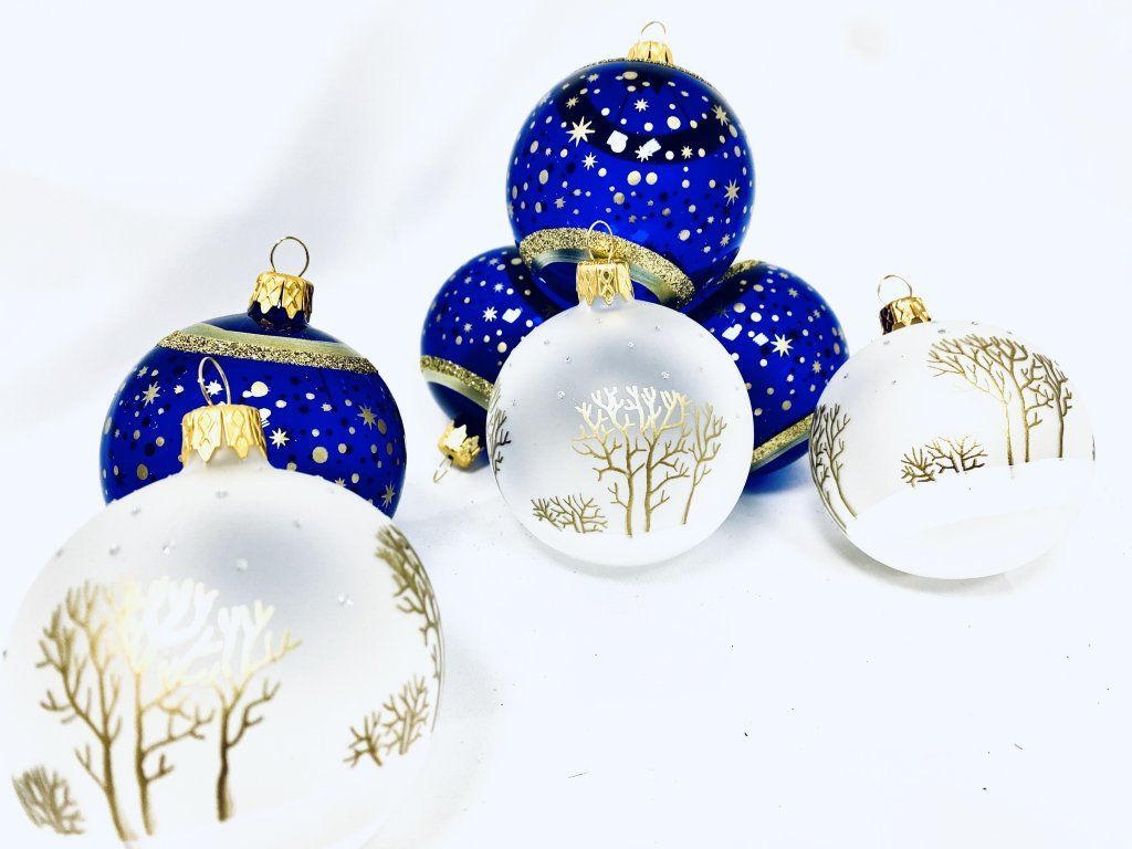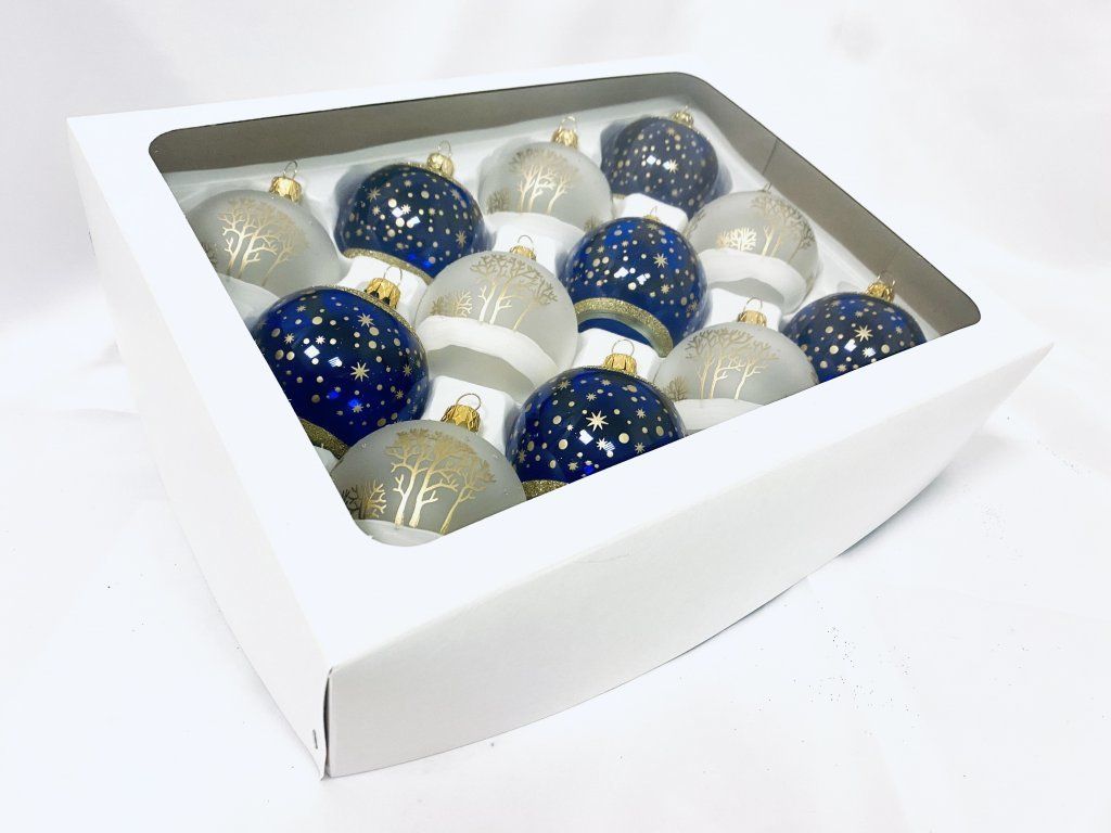 Sada 12 ks sklenených vianočných gulí 7 cm - motív Popolušky a Večernice (biela a modrá, veľkosť 7cm)"