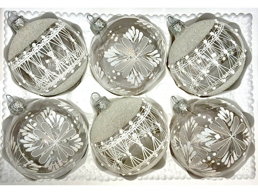 Luxusné sklenené vianočné ozdoby „Ľadová čipka“ s priemerom 8 cm v priehľadnom prevedení s ručne maľovanými bielymi vzormi a jemným trblietavým efektom. Tradičná česká sklárska práca s nádychom zimnej elegancie.