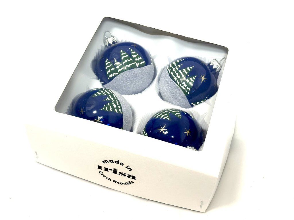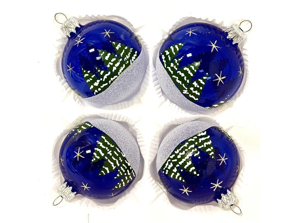 Sklenené vianočné ozdoby „Nočný zimný les“, 7 cm, tmavo modré so zasneženými stromami - sada 4 ks