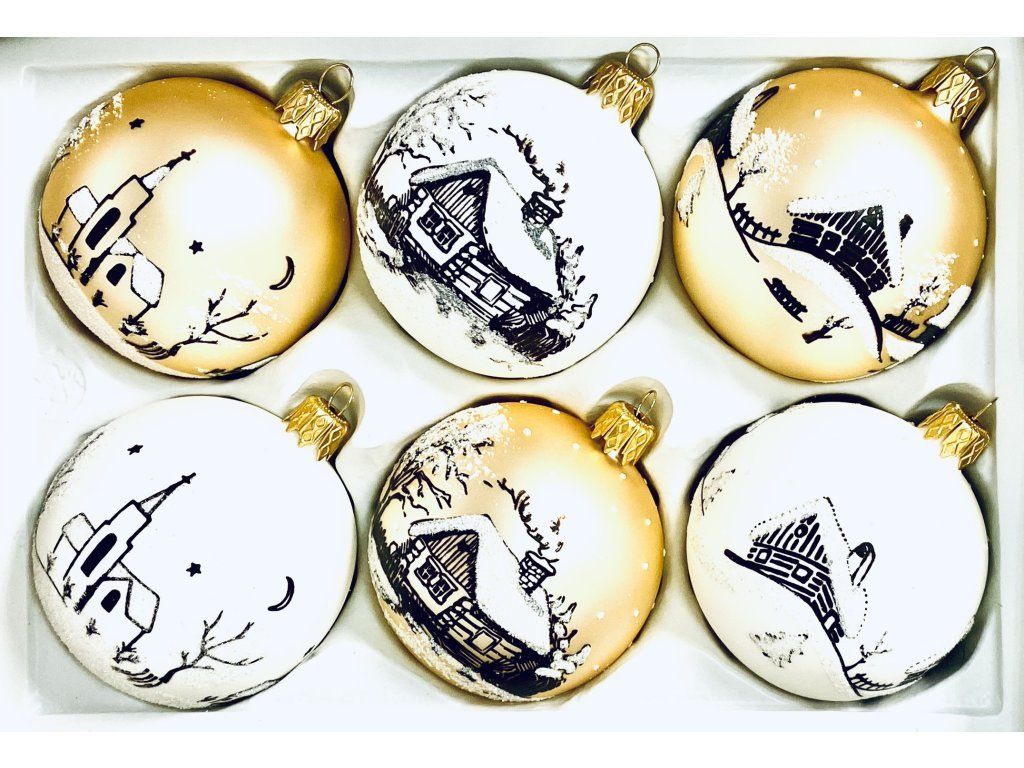 Sada sklenených vianočných gulí Zlatý vidiek - biela a zlatá s rôznymi motívmi hnedých chalúp a kostolov (Sada 6 ks, Veľkosť 7 cm)