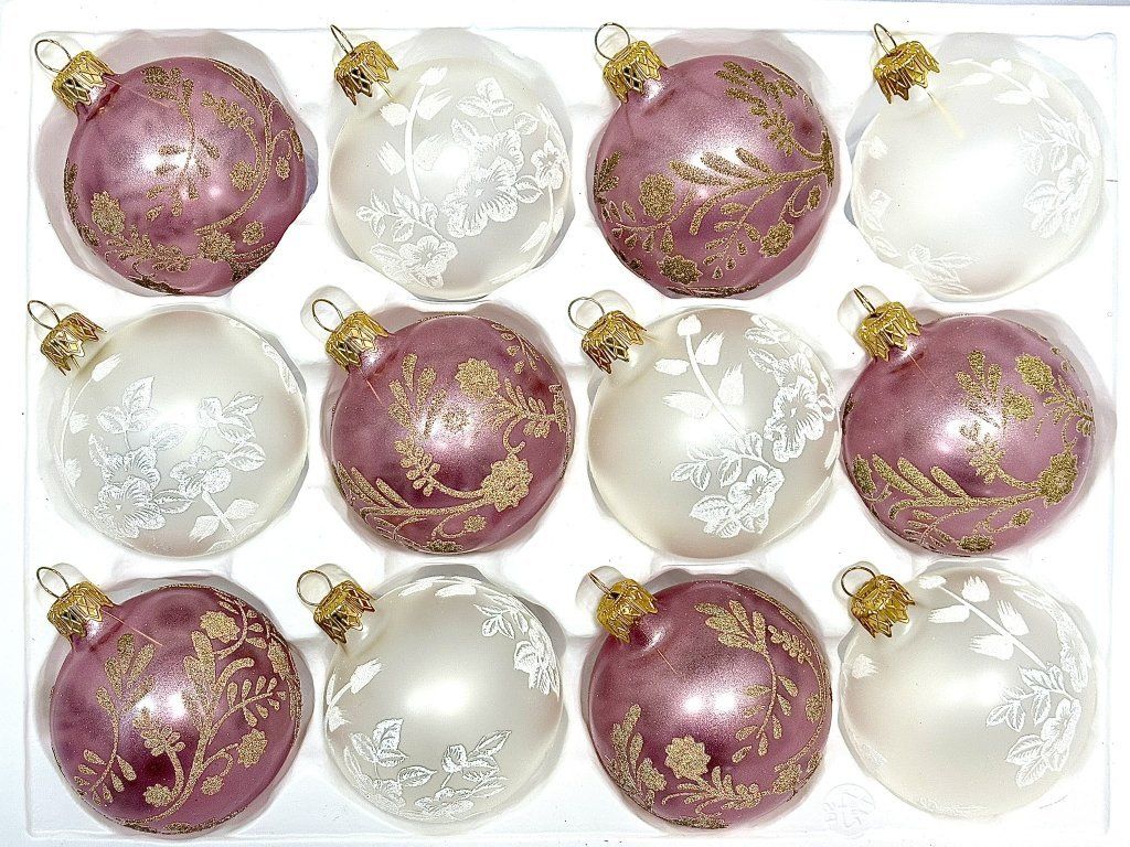 Luxusné sklenené vianočné ozdoby „Púdrová elegancia“ s priemerom 7 cm v kombinácii jemnej púdrovo ružovej a matnej bielej, zdobené ručne maľovanými kvetinovými ornamentmi v zlatej a ľadovo bielej farbe. Česká ručná výroba s nádychom noblesy.