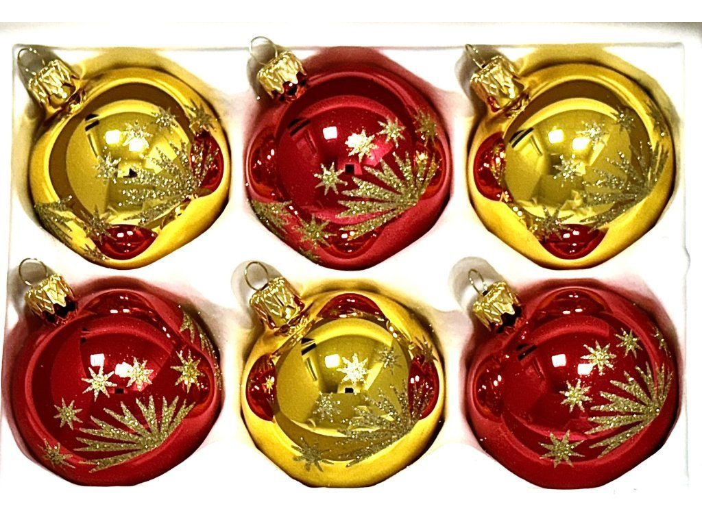 Sklenené vianočné gule 7 cm „Zlatá hviezdna žiara“ – Ručne zdobené v červenej a zlatej kombinácii – sada 6 ks