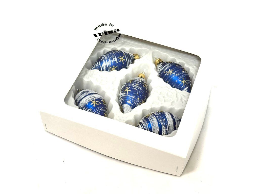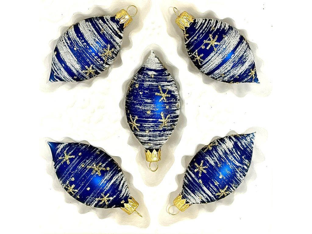 Súprava piatich sklenených ozdôb v tvare olivy (8 x 4 cm), ladených do sýto modrej farby s bielym efektom snehových pruhov a jemnými zlatými hviezdami. Vdýchnu každému stromčeku či vianočnému aranžmánu magickú atmosféru zimnej noci.