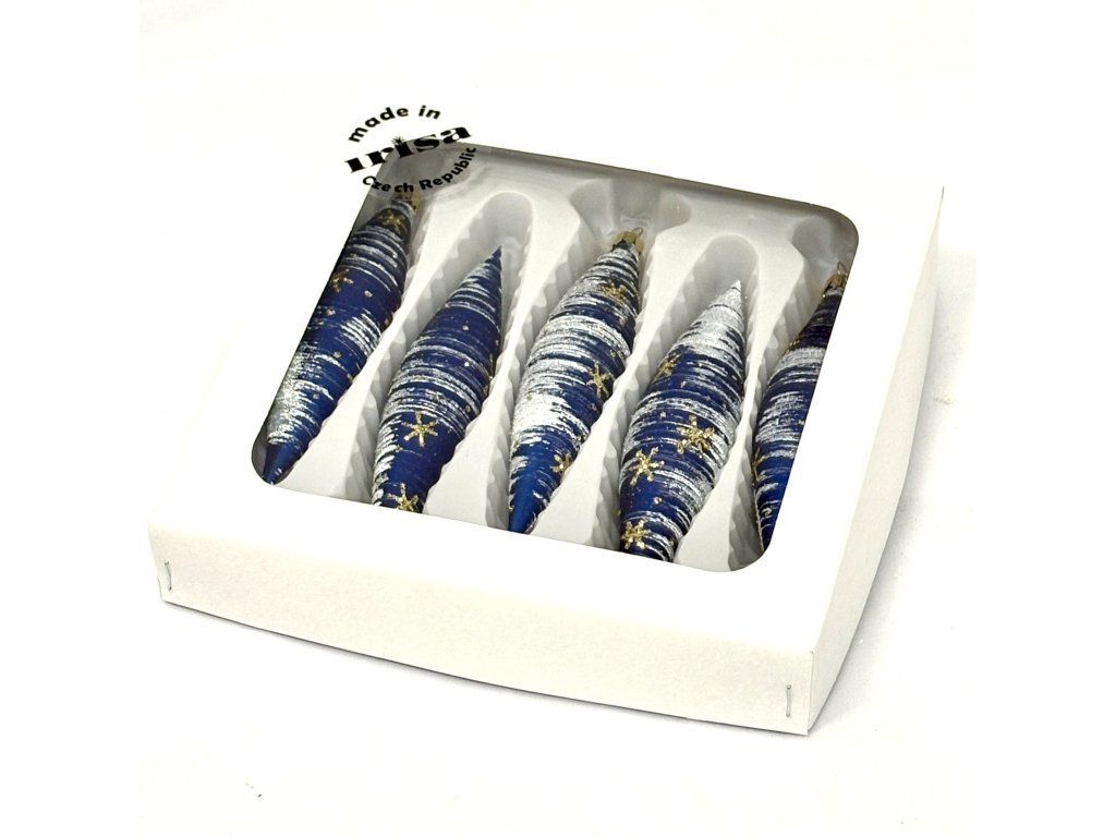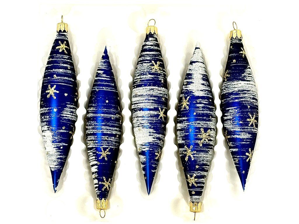 Súprava piatich štíhlych sklenených ozdôb o rozmere 14 x 3 cm v hlboko modrom prevedení, zdobených bielym trblietavým efektom a drobnými zlatými hviezdami. Ideálne pre elegantný vianočný stromček či iné sviatočné aranžmány.