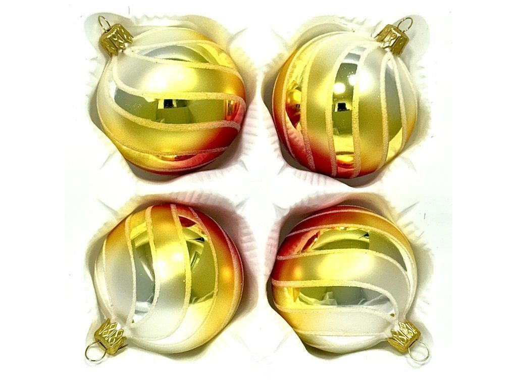 Sada štyroch sklenených gulí, ktoré upútajú pozornosť kombináciou žiarivej zlatej, jemného červeného nádychu a matných bielych pruhov v elegantnej špirále. Ideálne pre slávnostný vianočný stromček aj moderný aranžmán.