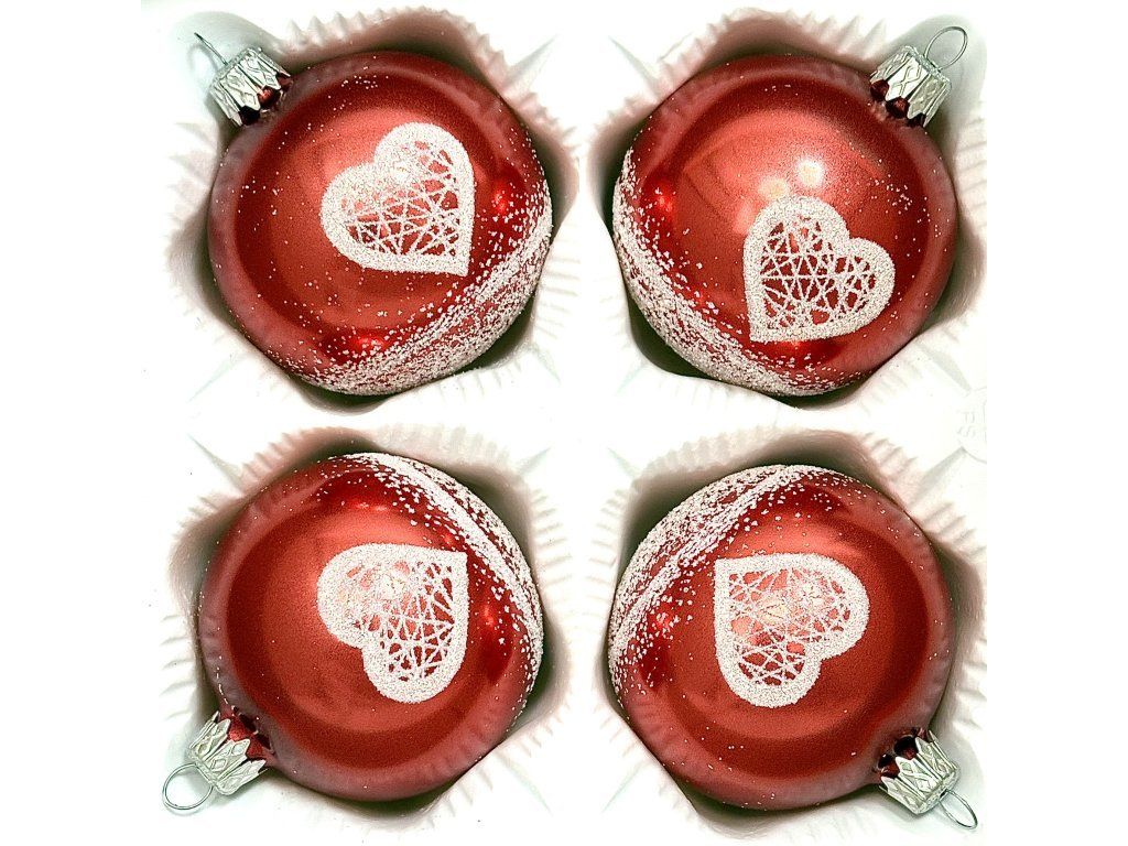 Červené sklenené vianočné gule so srdiečkami – sada 4 ks (7 cm)