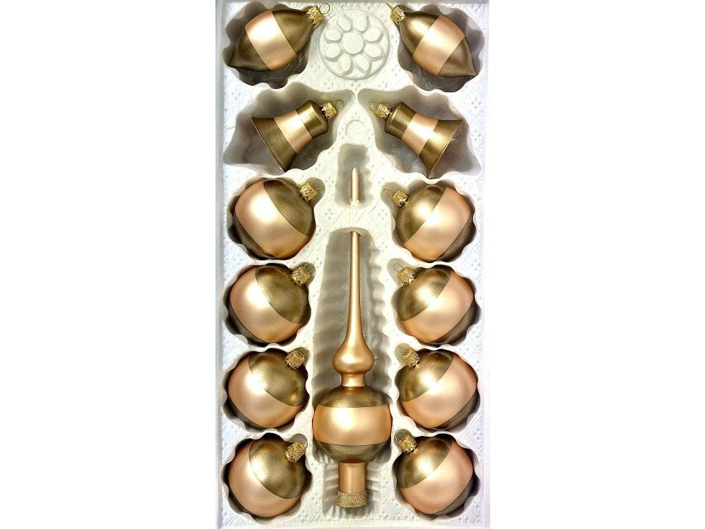 Elegantná bronzovo-zlatá sada 13 ks sklenených vianočných ozdôb so špicou. Ručná práca z českého skla dodá vášmu stromčeku noblesný vzhľad.