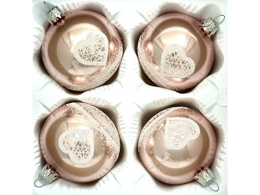 Romantické ružové vianočné gule so srdiečkami – sada 4 ks (7 cm)