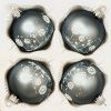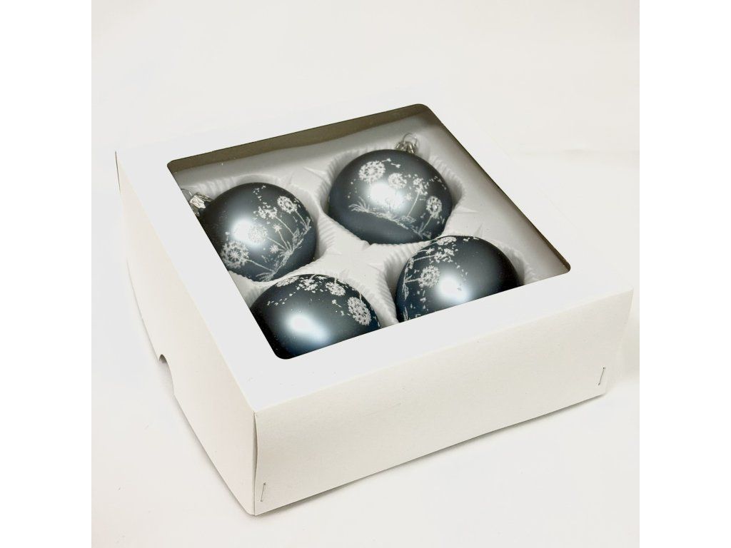Elegantná sada 4 sklenených vianočných gulí v šedom odtieni s motívom púpav. Ručná výroba zo SR.