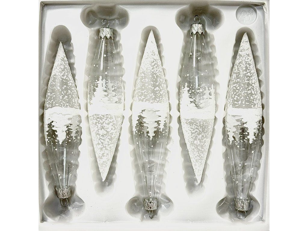Elegantná sada 5 sklenených vianočných cencúľov o veľkosti 14 cm s jemným dekorom zimnej krajiny a trblietavými vločkami prinesie na váš stromček kúzlo zimnej rozprávky.