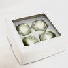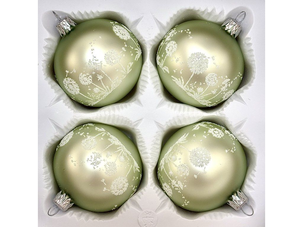 Sada 4 zelených vianočných gulí s bielym motívom púpav. Ručne fúkané a maľované české sklenené ozdoby.