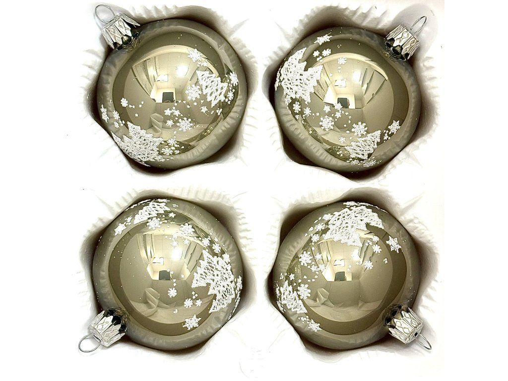 Kúzelná sada štyroch sklenených vianočných gulí s priemerom 7 cm prináša sviežu eleganciu v jemne zelenkavom odtieni so strieborným leskom. Ručne fúkané a maľované ozdoby sú zdobené bielymi motívmi zasnežených stromčekov a vločiek, ktoré navodia atmosféru zimnej rozprávky. Tieto tradičné české vianočné ozdoby z dielne Irisa sú ideálnou voľbou pre tých, ktorí hľadajú originálnu kombináciu prírodných tónov a sviatočnej noblesy. Skvele sa hodia k bielej, zlatej i klasicky zelenej výzdobe a dodajú vášmu stromčeku jedinečný charakter.