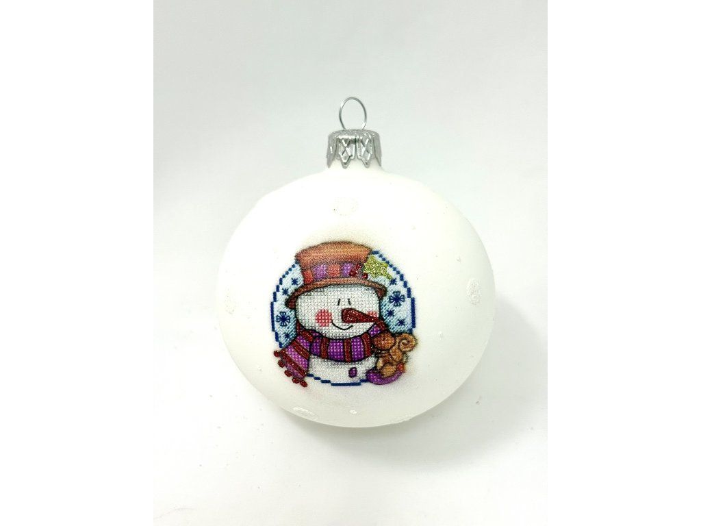 Originálna biela fúkaná sklenená guľa s priemerom 8 cm s jemným matným povrchom a ručne zdobeným motívom snehuliaka.