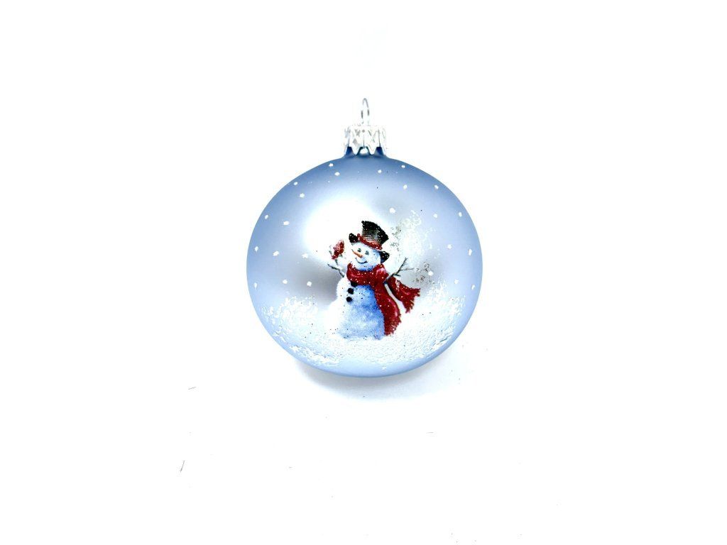 Elegantná sklenená vianočná guľa s priemerom 8 cm s motívom usmievavého snehuliaka v zasneženej zimnej krajine. Ručne fúkaná a zdobená, ideálna na vianočnú výzdobu.