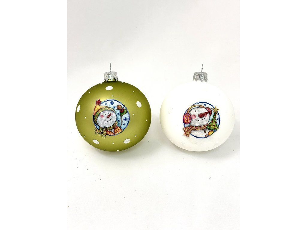 Exkluzívna sada 2 matných fúkaných sklenených gulí s priemerom 8 cm v kombinácii snehovo bielej a zeleno-zlatej, zdobených bielymi trblietavými bodkami a roztomilými motívmi snehuliaka s vianočným stromčekom a darčekom.