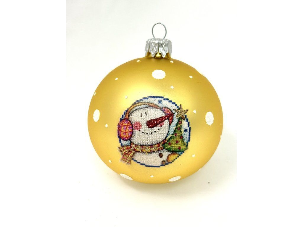 Sklenená vianočná ozdoba so zlatým matným povrchom, zdobená veselým snehuliakom s vianočným stromčekom. Ručne vyrábaná.