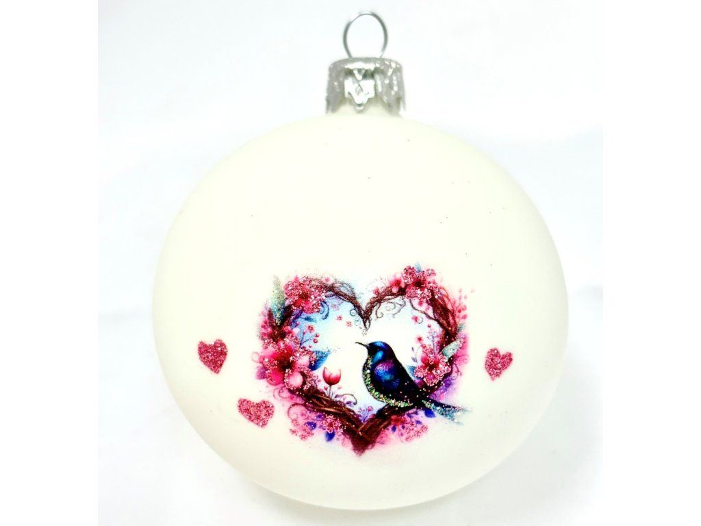 Elegantná vianočná guľa s priemerom 8 cm, zdobená motívom vtáčika v ružovom srdci plnom kvetov a trblietok, balená v luxusnej darčekovej krabičke.
