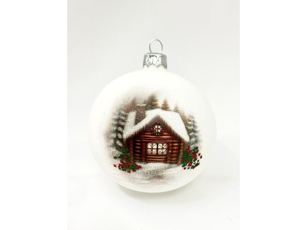 Ručne fúkaná sklenená guľa s priemerom 8 cm s motívom zasneženej chalúpky a vianočných vencov. Dodáva sa v darčekovom balení, možnosť personalizácie textom.